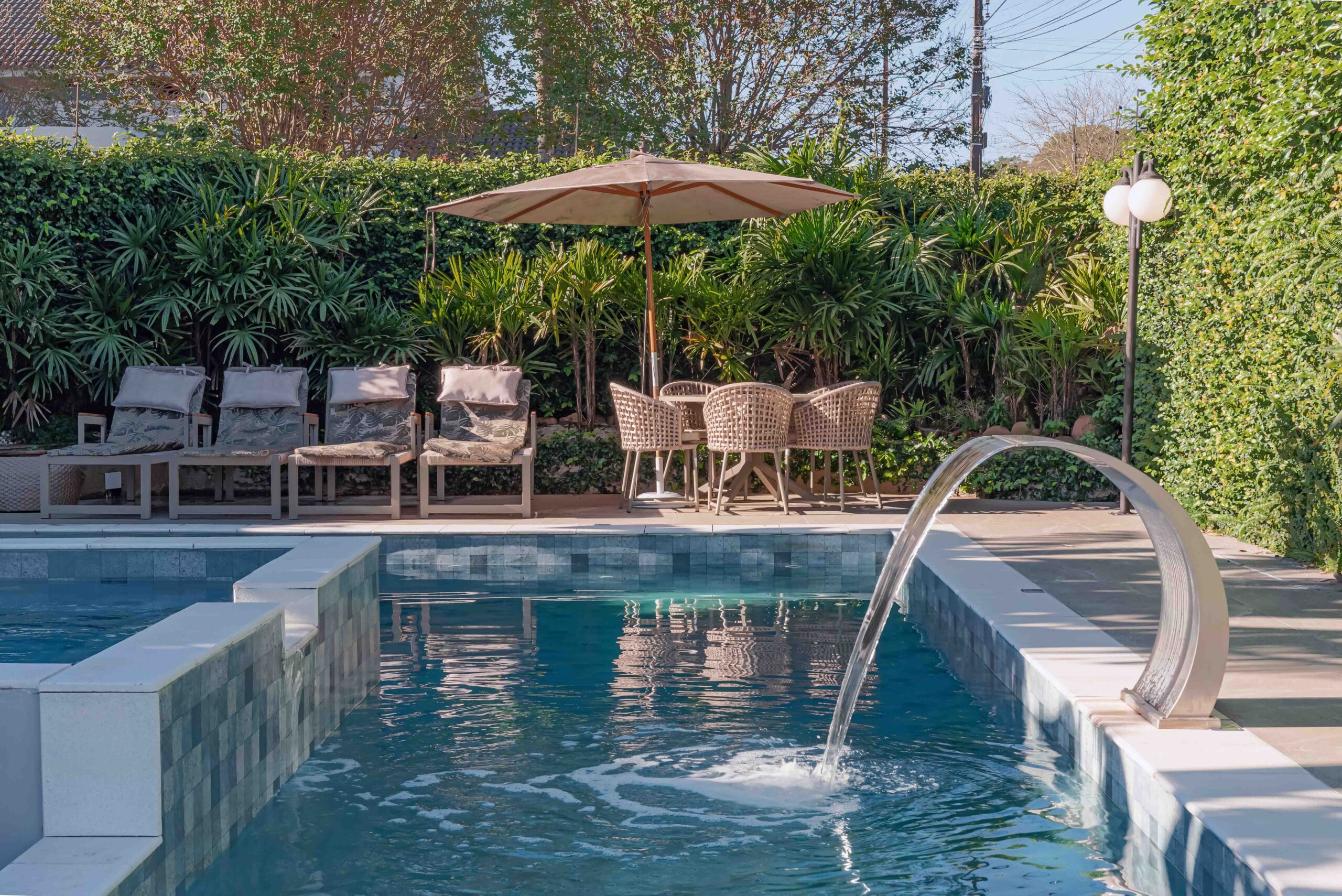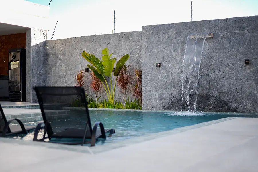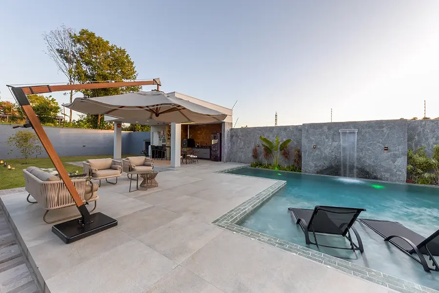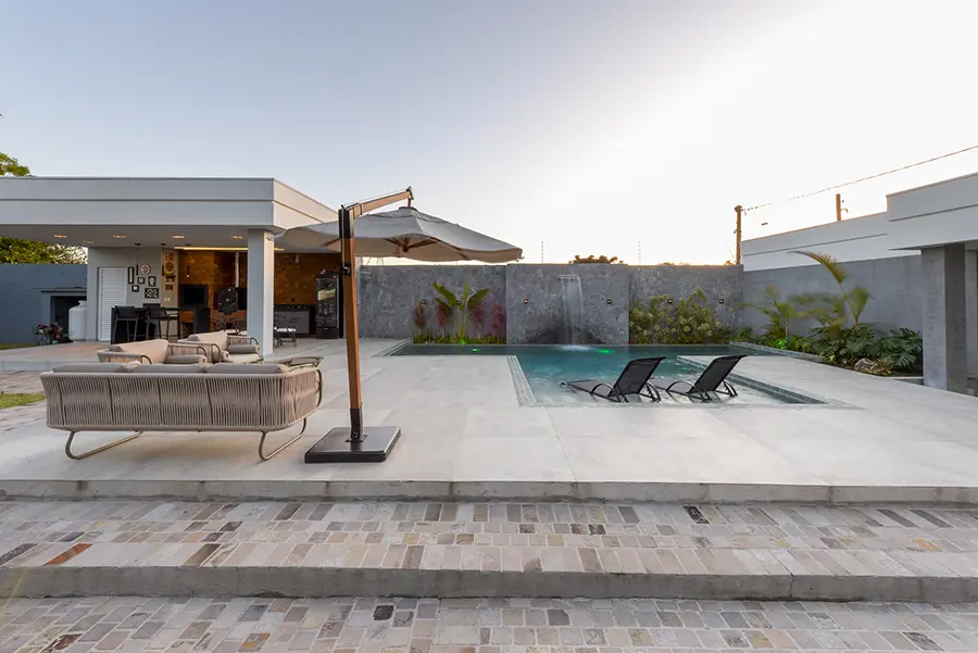 Projeto completo de espaços ao ar livre. Desenvolvemos toda a área externa incluindo paisagismo, piscina, deck, churrasqueira e áreas de estar. Você visualiza o resultado através de imagens realistas em 3D.