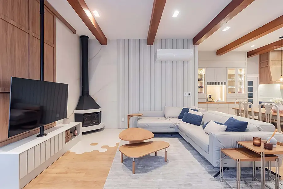 Planejamento completo de ambientes internos. Definimos todos os elementos: cores, revestimentos, iluminação, mobiliário e decoração. Você visualiza o resultado final através de imagens realistas em 3D antes de iniciar.